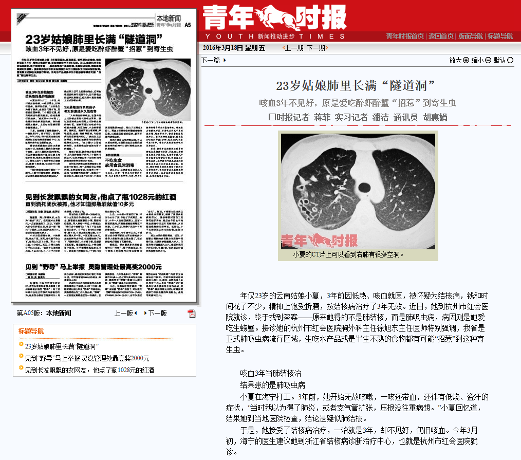 记者进一步检索新闻,找到了一篇2016年3月18日发布于《青年时报》题为《23岁姑娘肺里长满“隧道洞” 咳血3年不见好,原是爱吃醉虾醉蟹“招惹”到寄生虫》的报道。报道称,年仅23岁的云南姑娘小夏在浙江海宁打工。3年前因低热、咳血就医,被怀疑为结核病,钱和时间花了不少,精神上饱受折磨,按结核病治疗了3年无效。她到杭州市红会医院就诊,终于找到答案——原来她得的不是肺结核,而是肺吸虫病,病因则是她爱吃生螃蟹。接诊她的杭州市红会医院胸外科主任徐旭东主任医师特别强调,浙江是肺吸虫病流行区域,生吃水产品或是半生不熟的食物都有可能“招惹”到这种寄生虫。