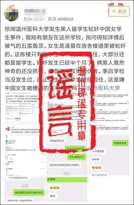 5月24日晚,新浪微博用户@归**义发布了一条“耸人听闻”的消息,内容称,惊闻温州医科大学黑人留学生轮奸中国女学生,女生是凌晨在宿舍楼道被轮奸的,而且发生了半个月,俩个黑人还没抓住……该用户还声称自己有朋友在这学校,以增加可信度。