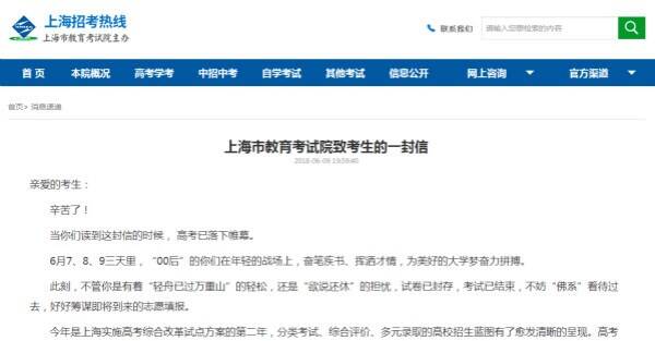 2018年上海高考6月9日落幕,上海市教育考试院当晚在“上海招考热线”网站发布致考生的一封信,祝福每一个考生,不畏过往、不惧将来,并提醒考生在接下来的志愿填报阶段,保持警惕,慧眼识骗,切勿相信各种校测“包过”培训班。