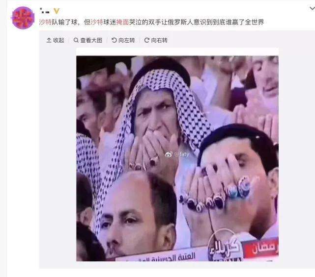 有网友调侃:“沙特队输了球,但沙特球迷掩面哭泣的双手让俄罗斯人意识到到底谁赢了全世界。”看到这一幕,有网友们不淡定了,直呼这哪儿像是痛苦?分明是在炫耀好吧?贫穷限制了我们的想象力。