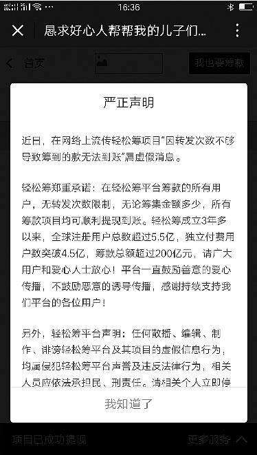 两天后,记者再次点开链接,发现已筹金额变为150009元,页面上方出现一条滚动的“严正声明”:近日,在网络上流传轻松筹项目“因转发次数不够导致筹到的款无法到账”属严重虚假消息……页面下方则出现“筹款已结束,已提现到账”的字眼提示。