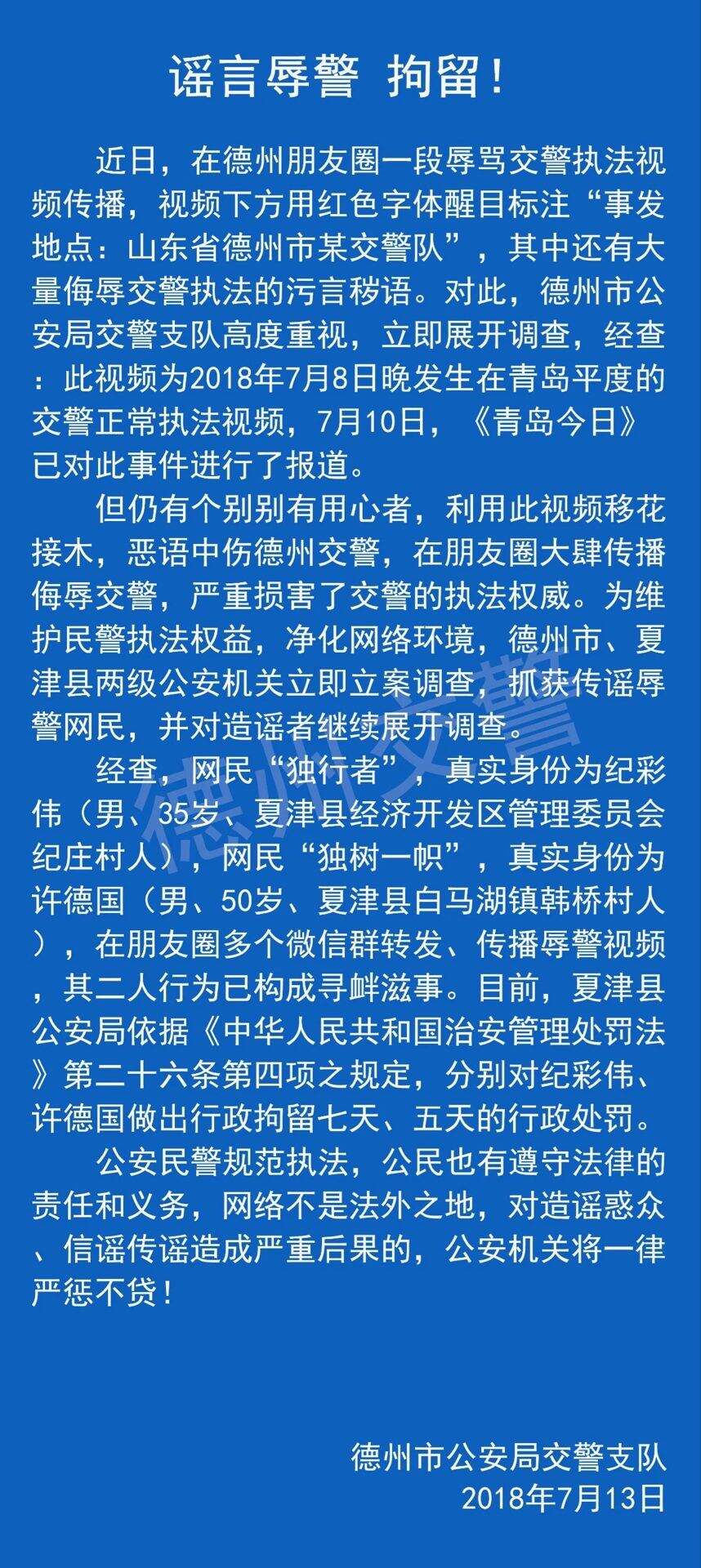 为维护民警执法权益,德州公安机关立即立案调查,抓获传谣辱警网民,并对造谣者继续展开调查。经查,网民“独行者”,真实身份为纪彩伟(男、35岁、夏津县经济开发区管理委员会纪庄村人),网民“独树一帜”,真实身份为许德国(男、50岁、夏津县白马湖镇韩桥村人),在朋友圈多个微信群转发、传播辱警视频,其二人行为已构成寻衅滋事。目前,夏津县公安局依据《中华人民共和国治安管理处罚法》第二十六条第四项之规定,分别对纪彩伟、许德国做出行政拘留七天、五天的行政处罚。