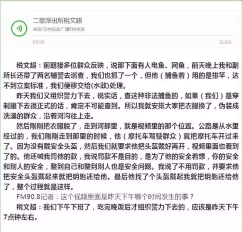 习水县公安局专人对该事件进行调查后发现,原来,泳裤执法男子实为二里镇派出所所长税文超。7月17日19时许,民警税文超等4人化装成游泳群众查找非法捕鱼的违法犯罪嫌疑人。其间,发现黄某有未戴安全头盔驾驶二轮摩托车的违法行为,为保护驾驶人生命安全,税文超出示警察证后,对黄某违法行为给予批评纠正。19时20分许,在收到亲属送来安全头盔后,税文超同意黄某驾车离开,没有罚款。