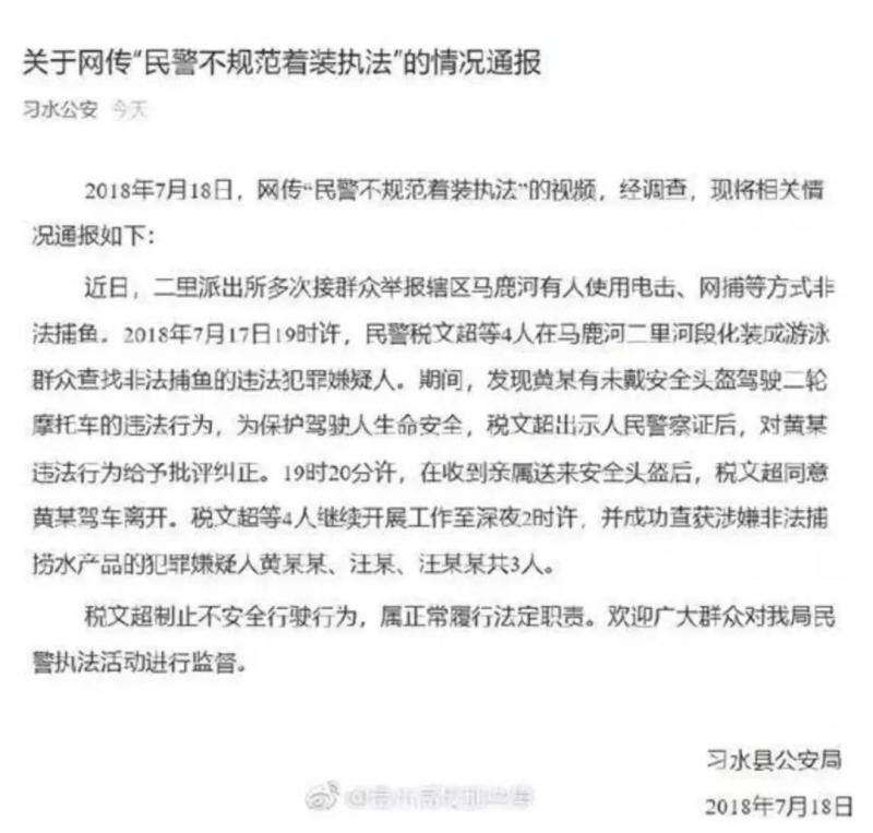 7月18日,贵州习水警方就此事给出官方通告。通告表示,当时这位民警并未休假,之所以未穿警服,是因为在执行一项便装任务。