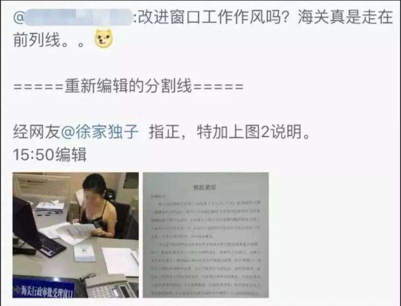 7月19日下午,有网民发布一名身穿带吊装的海关工作人员工作图片,并配文称“改进窗口工作作风吗?海关真是走在前列线”。