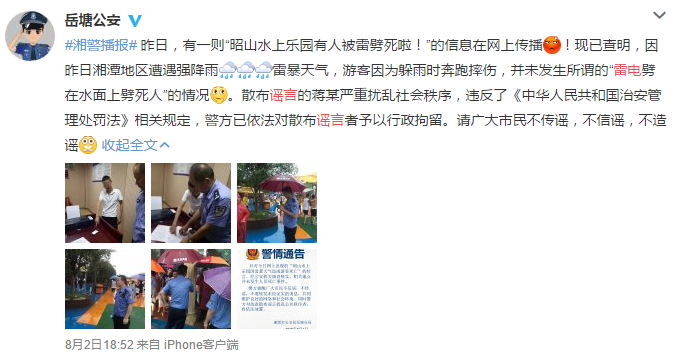 一、湖南 · 网传“湘潭市昭山水上乐园有人被雷劈死” 警方:系谣言