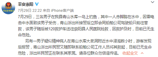 7月29日,网上有传言称咸宁市崇阳县几名男子被雷击毙,对此崇阳县公安局及时发布事情真相,紧急辟谣,称有三名男子在崇阳县青山水库一岛上钓鱼,其中一人赤脚踏在水中,因雷电击中水面致该男子受伤,并非直接被雷击毙。青山派出所接警后立即会同船舶公司驾驶船只前往营救,该男子随后被120救护车送往崇阳县人民医院抢救,因救护及时,目前已无生命危险。
