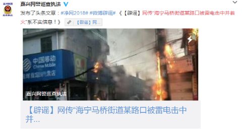 三、浙江 · 网传“嘉兴市海宁马桥街道某路口被雷电击中并着火”系不实信息