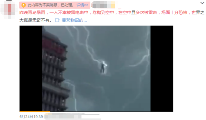 6月24日,有网民发微博称“昨晚青岛暴雨,一人不幸被雷电击中,卷抛到空中,在空中且多次被雷击,场面十分恐怖,世界之大真是无奇不有。”