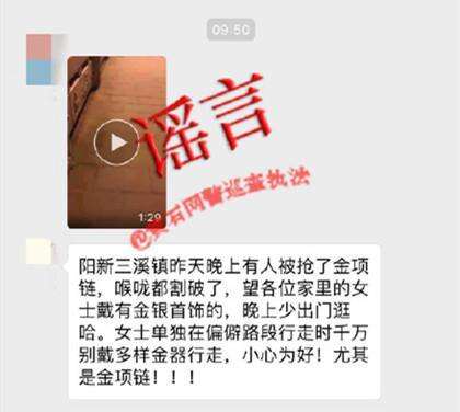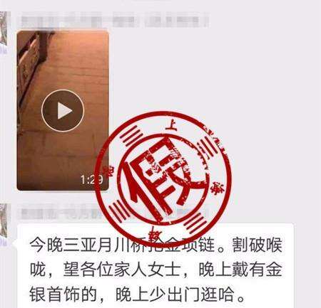 8月17日,湖北省黄石市公安局网安支队通过官方平台发布了辟谣声明,称微信群内近日流传一段时长为1分29秒的视频,传言称三溪镇一名女子因被抢金项链而遭割喉,家里有女士戴金银饰品的,晚上不要出门逛,注意安全。经网警部门核实,黄石暂未接到相关警情,该视频并非发生在本地。