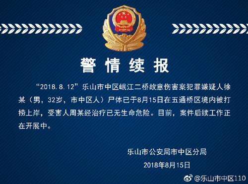 8月15日,据乐山警方的最新通报显示,目前此案正式告破,跳江犯罪嫌疑人尸体已被打捞上岸,受害人周某经治疗已无生命危险,案件后续工作正在开展中。