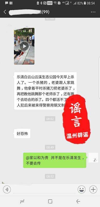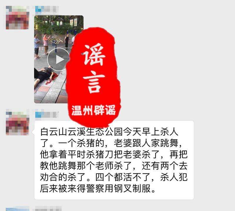 近日,本地微信群里流传“乐清白云山云溪生态公园发生杀人案”等信息,并附有现场视频。辟谣君随即向乐清当地有关部门了解情况,经核实,该信息系谣言。乐清当地没有名为“白云山云溪生态公园”的公园,也没有发生与该信息内容符合的案件。