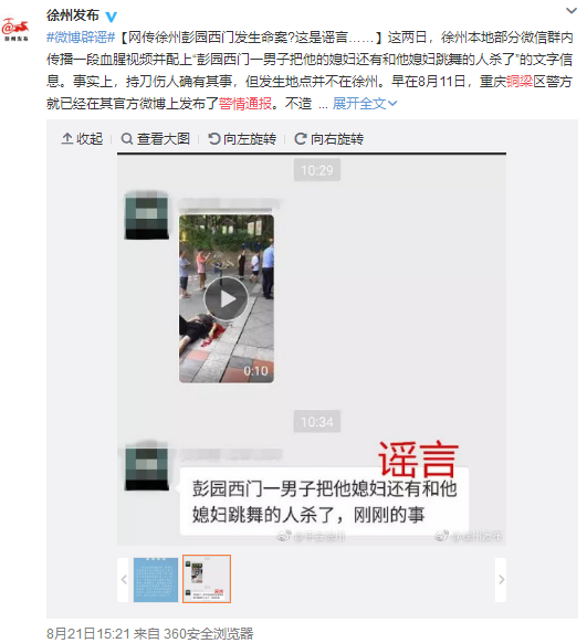 辟谣君发现有关该案件的不同版本已在新余、上饶、漳州龙海、达州、徐州、屯溪等多地流传过,视频、图片和内容描述几乎一模一样,唯一不同就是发生在全国不同的城市!@徐州发布、@屯溪发布等官方微博纷纷发布了辟谣博文。