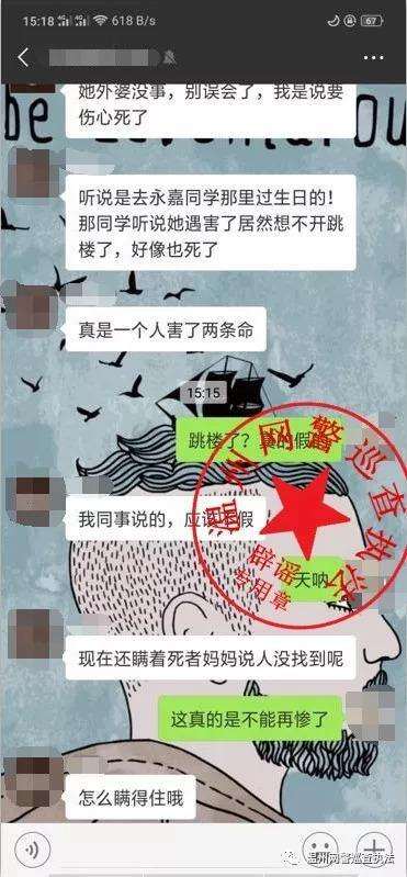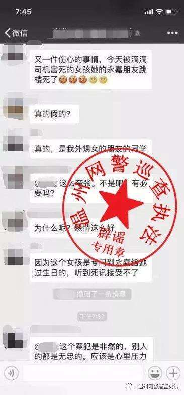 8月24日,乐清“滴滴顺风车”司机杀人案发生之后,微信群里流传一条“乐清滴滴女子因参加同学生日被害,现同学想不开跳楼自杀”的传言。