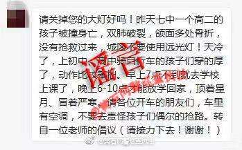 2017年9月,福建省寿宁警方也对当地流传的“一中的高二学生因远光灯身亡”的帖子进行辟谣。警方指出,当地并未发生此类事件,传言中所附视频也并非学生被撞身亡,而是寿宁当地一妇女骑电动车与一小轿车发生刮擦的交通事故。