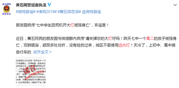目前,已有江苏、湖北、福建等多地网警对当地的相关传言进行了辟谣。10月29日,湖北黄石警方“@黄石网警巡查执法”发布微博表示,朋友圈疯传的“七中学生因司机开大灯被撞身亡”系谣言,经公安机关多方核实,黄石未发生相关警情,网帖里的交通事故是假的。不过警方也同时提醒网友,滥用远光灯是广大交通参与者深恶痛绝的交通违法行为,请从自身和他人安全角度出发,养成合理使用远光灯的习惯,各位司机朋友在行车路上也要严格遵守交通法规,谨慎驾驶,确保行车安全。