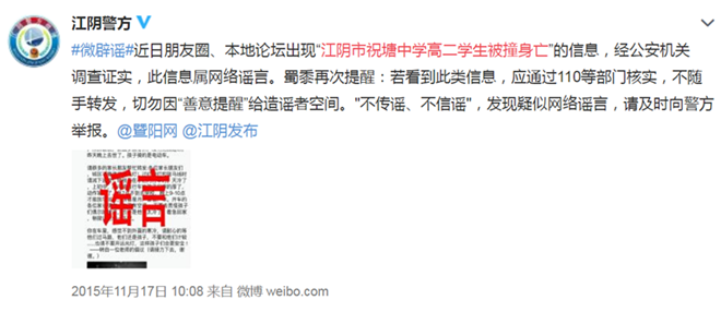 2015年11月,江苏省江阴警方通过微博辟谣:“近日朋友圈、本地论坛出现‘江阴市祝塘中学高二学生被撞身亡’的信息,经公安机关调查证实,此信息属网络谣言。蜀黍再次提醒:若看到此类信息,应通过110等部门核实,不随手转发,切勿因‘善意提醒’给造谣者空间。”