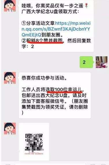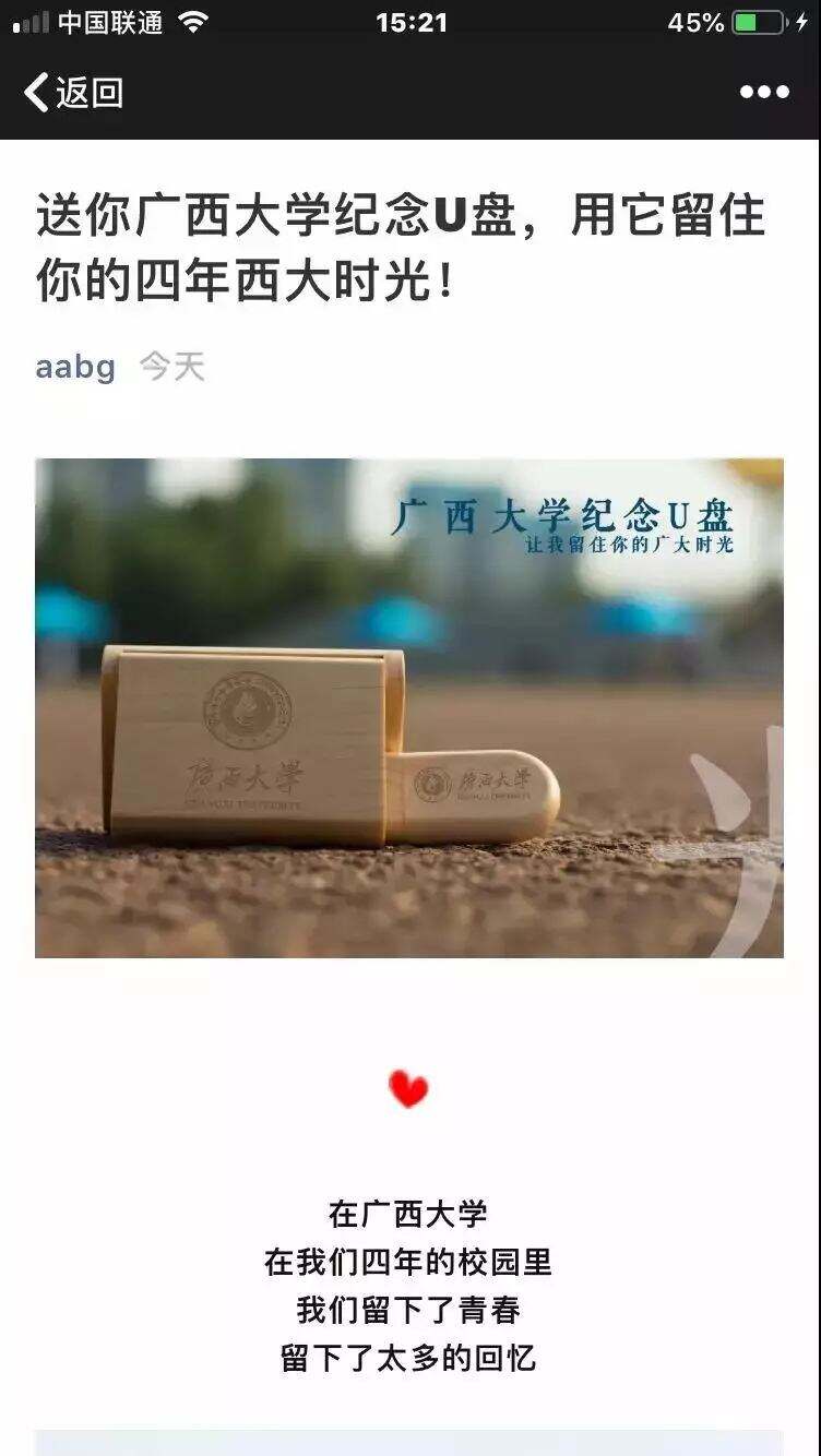 双十一期间,一则“送广西大学U盘”的推文称,要领取这枚纪念U盘,只需回复数字“1”即可。但真正参与了活动的同学却发现没有那么简单。