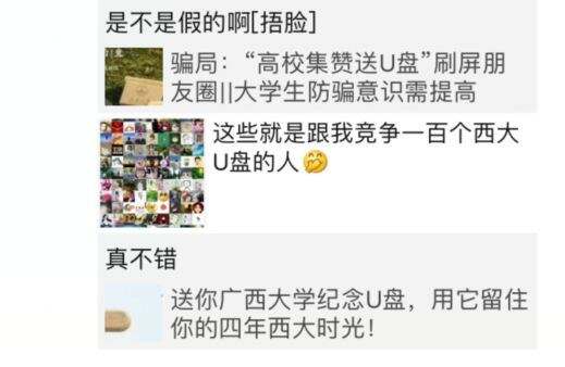 对此11月11日晚,广西大学官方微信迅速辟谣表示,目前,该校没有任何部门及媒体组织筹办“集赞送U盘”的活动,请大家切勿上当受骗,注意保护个人信息。