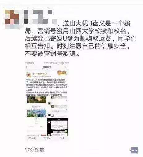 还有不少参加过活动的网友,发帖揭露“送XX学校U盘”活动其实是一个骗局,一些公众号后续会以寄送U盘为由骗取运费,还会主动要求参与者添加某微商账号为好友。