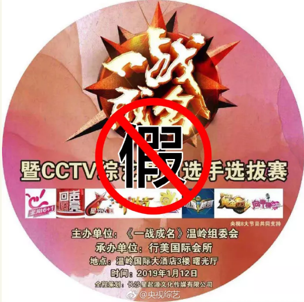 对此,中央电视台综艺频道官方微博发布辟谣声明称:综艺频道没有名为“一战成名”的栏目,8大栏目也从未授权该机构举办任何选拔活动。对于以央视综艺的名义开展不实活动的行为,央视综艺频道保留进一步追究法律责任的权利。