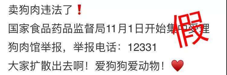 近日,一条有关“卖狗肉违法”的信息在网上热传:“卖狗肉违法了!国家食品药品监督局11月1日开始集中受理狗肉馆举报,举报电话:12331。大家扩散出去!”