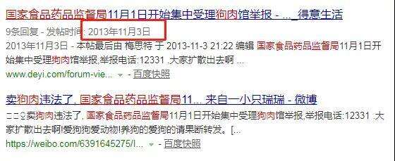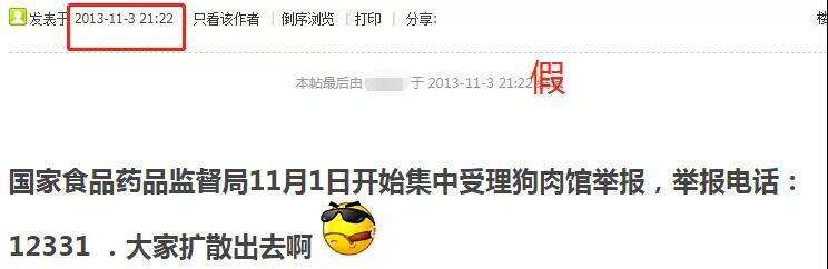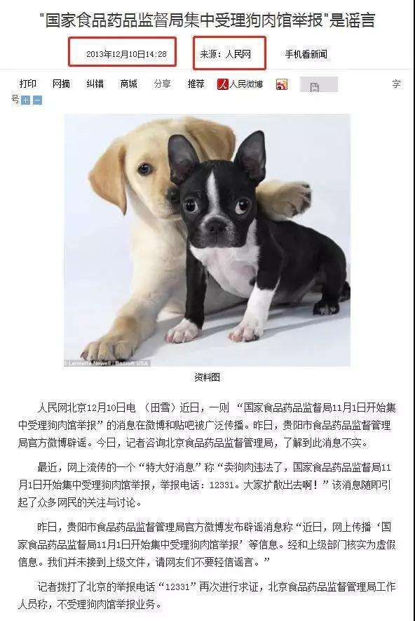 搜索可发现,2013年在网上流传的这个传言版本,与目前网上流传的内容完全一致,当时在网上引起了众多网友的关注和讨论。2013年12月10日,人民网对此传言进行了辟谣,当时的北京市食品药品监督管理局工作人员在接受人民网采访时表示,12331投诉热线并不受理狗肉馆举报业务。