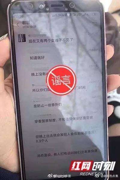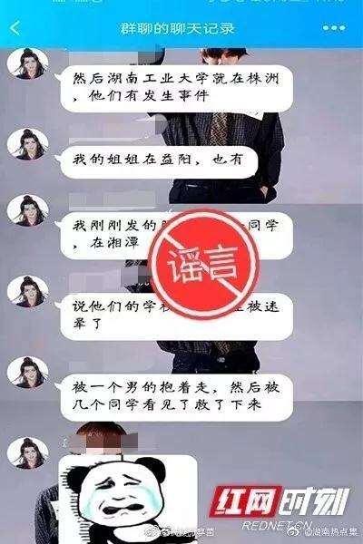 谣言:“最近株洲这边有团队拐女大学生,他们可能会去长沙。”“所有女生注意一下,昨天到今天在中南林科大两名以上女生被奸杀,犯罪团伙5名以上,现在凶手还没抓到......”