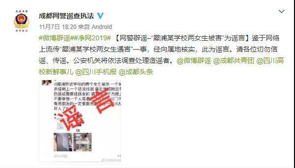 真相:11月7日,@成都网警巡查执法回应:经向属地核实,此为谣言。
