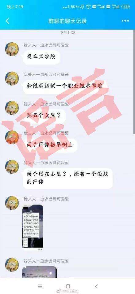 谣言:“河南商丘工学院、商丘职业技术学院共5名女学生被害。目前只找到一名女生尸体,其余人还未找到。”