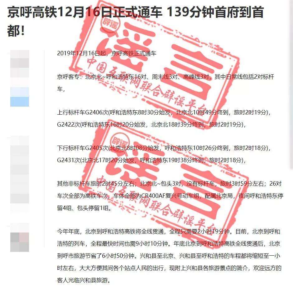 呼和浩特到北京的铁路都需经过京张铁路段,京张高铁正在联调联试中,只有开始试运行了,才会根据试验情况规划运行图。而该消息已经出现运行图,所以这个消息不属实。