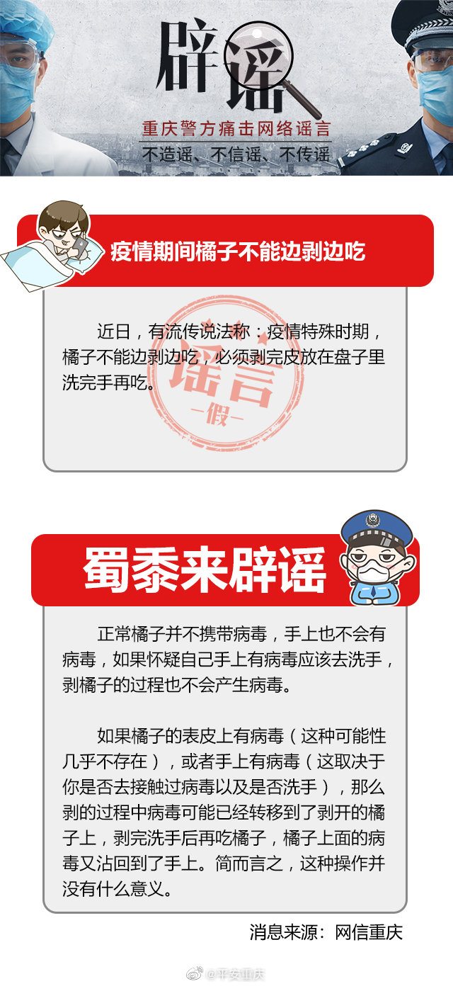 浙江辟谣网据网信重庆:近日,有流传说法称:疫情特殊时期,橘子不能边剥边吃,必须剥完皮放在盘子里洗完手再吃。