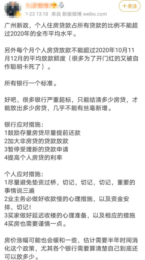 1月23日,有市场消息称,广州地区出现新政,即“个人住房贷款占所有贷款的比例不能超过2020年的全市平均水平”;而在此情况下,所有银行应对的措施是“暂停受理新的贷款申请”。