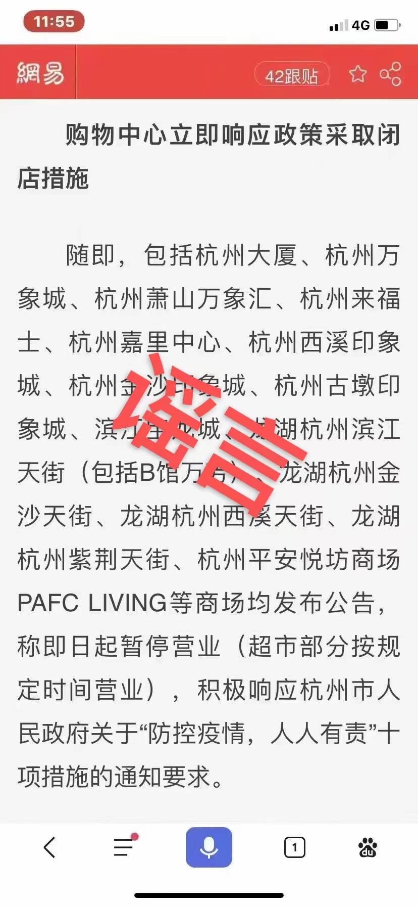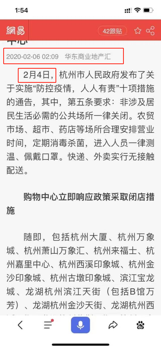 那么这张截图是哪里来的?原来是2020年2月6日的新闻,也就是新冠疫情刚刚开始的那一波商场闭店。而微信群里流传的那张图,硬生生把新闻发布的时间给截掉了。