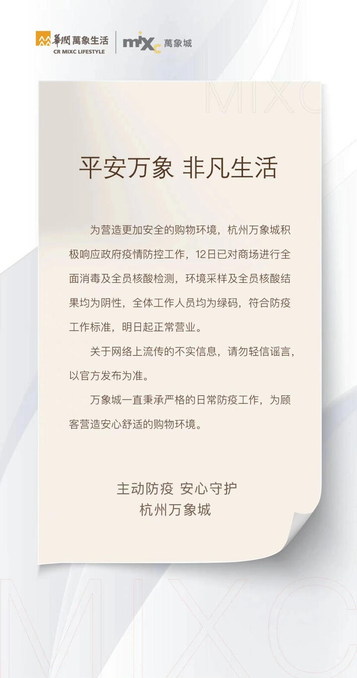 4月12日晚,@杭州万象城MIXC官方微博消息,为积极响应政府疫情防控工作,12日已对商场进行全面消毒及全员核酸检测,环境采样及全员核酸检测结果均为阴性,全体工作人员均为绿码,符合防疫工作标准,13日起正常营业。