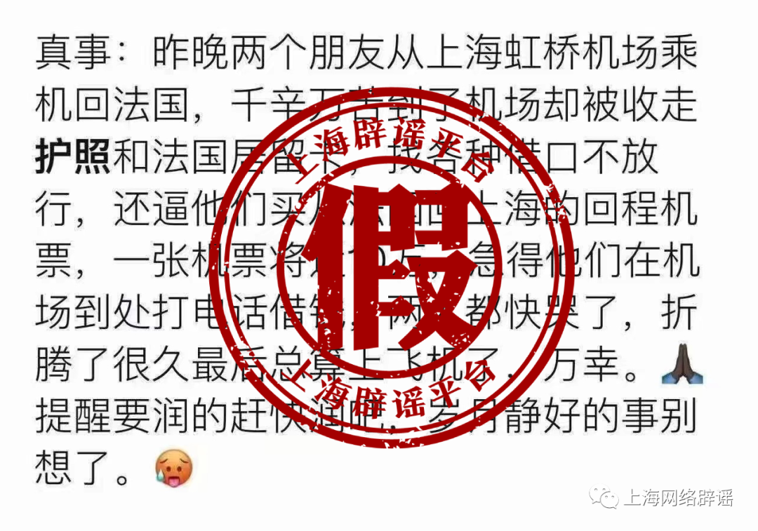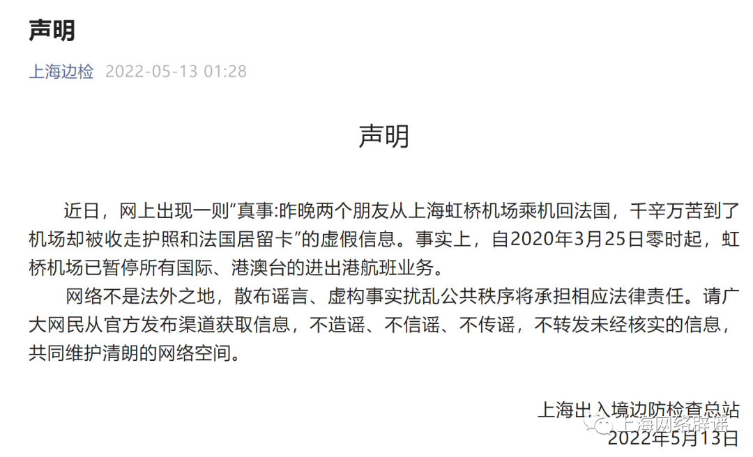 近日,网上出现一则“真事:昨晚两个朋友从上海虹桥机场乘机回法国,千辛万苦到了机场却被收走护照和法国居留卡”的虚假信息。对此,上海出入境边防检查总站发布声明表示,事实上,自2020年3月25日零时起,虹桥机场已暂停所有国际、港澳台的进出港航班业务。