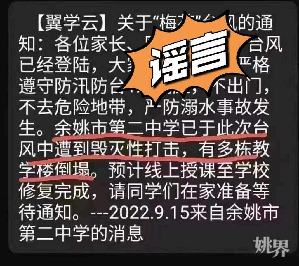 浙江辟谣平台据姚界客户端消息 网友在网络传播信息称:“余姚市第二中学已于此次台风中遭到毁灭打击,有多栋教学楼倒塌”。经有关部门核实,此为不实信息。