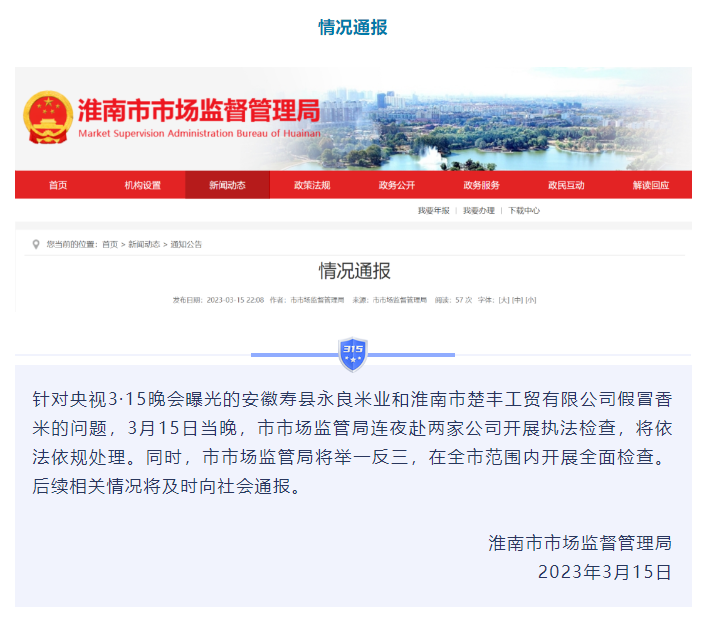 安徽省市场监管局当晚发布情况通报称,合肥、淮南两地市场监管执法人员第一时间赶赴现场进行查处。安徽省市场监管局已派专人赴两市进行现场指导。声明还称,安徽省市场监管局召开紧急会议,研究部署对全省大米加工企业进行全面排查,整治各类风险隐患,严厉打击违法行为。