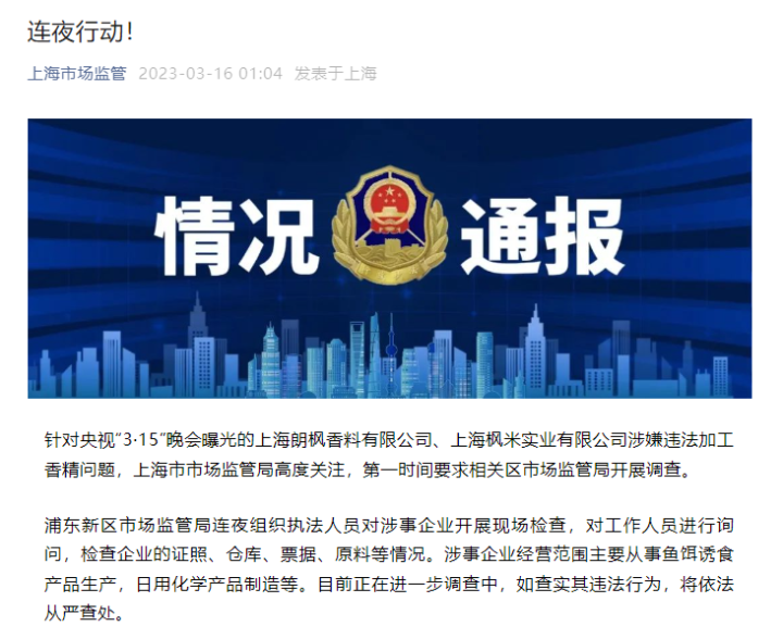 上海市场监管局发布通报,浦东新区市场监管局连夜组织执法人员对涉事企业开展现场检查,对工作人员进行询问,检查企业的证照、仓库、票据、原料等情况。涉事企业经营范围主要从事鱼饵诱食产品生产,日用化学产品制造等。目前正在进一步调查中,如查实其违法行为,将依法从严查处。