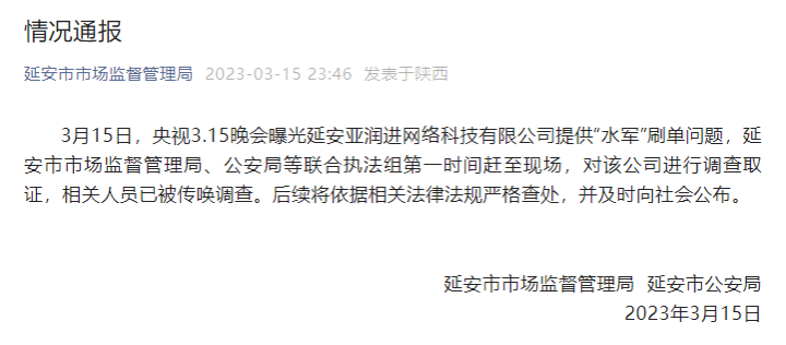 3月15日晚间,延安市市场监督管理局、延安市公安局发布情况通报:3月15日,央视3.15晚会曝光延安亚润进网络科技有限公司提供“水军”刷单问题,延安市市场监督管理局、公安局等联合执法组第一时间赶至现场,对该公司进行调查取证,相关人员已被传唤调查。后续将依据相关法律法规严格查处,并及时向社会公布。