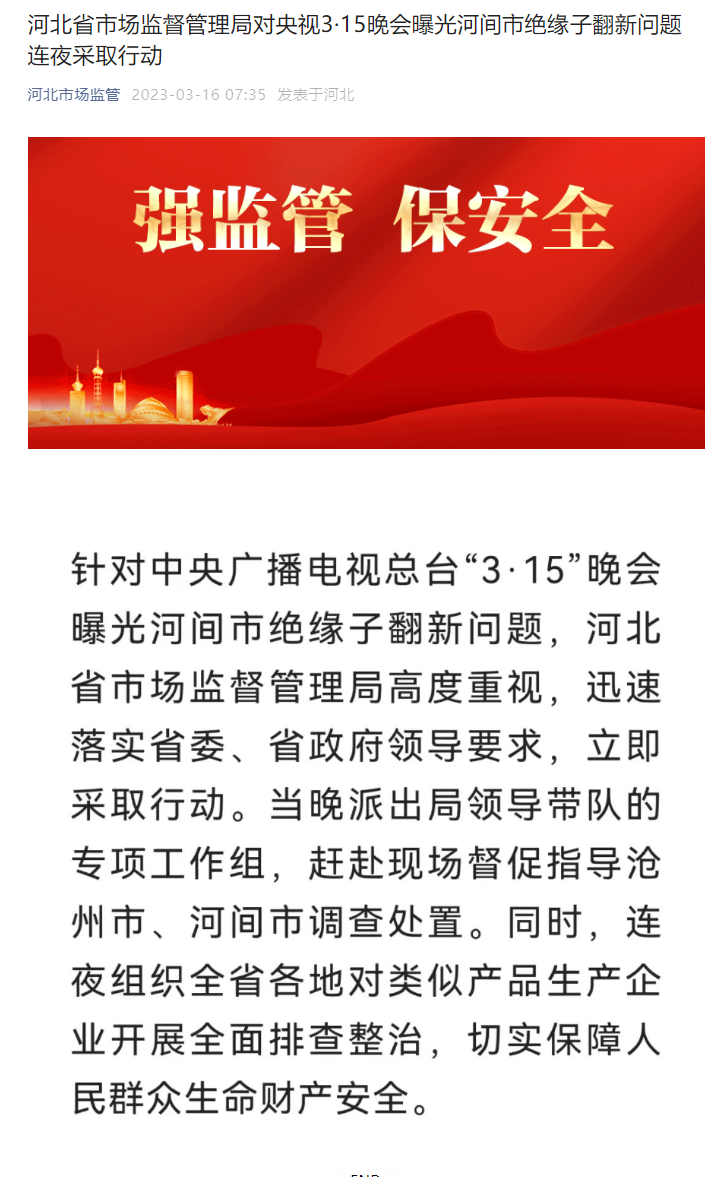 据河北市场监管官微消息,针对中央广播电视总台“3·15”晚会曝光河间市绝缘子翻新问题,河北省市场监督管理局高度重视,迅速落实省委、省政府领导要求,立即采取行动。当晚派出局领导带队的专项工作组,赶赴现场督促指导沧州市、河间市调查处置。同时,连夜组织全省各地对类似产品生产企业开展全面排查整治,切实保障人民群众生命财产安全。