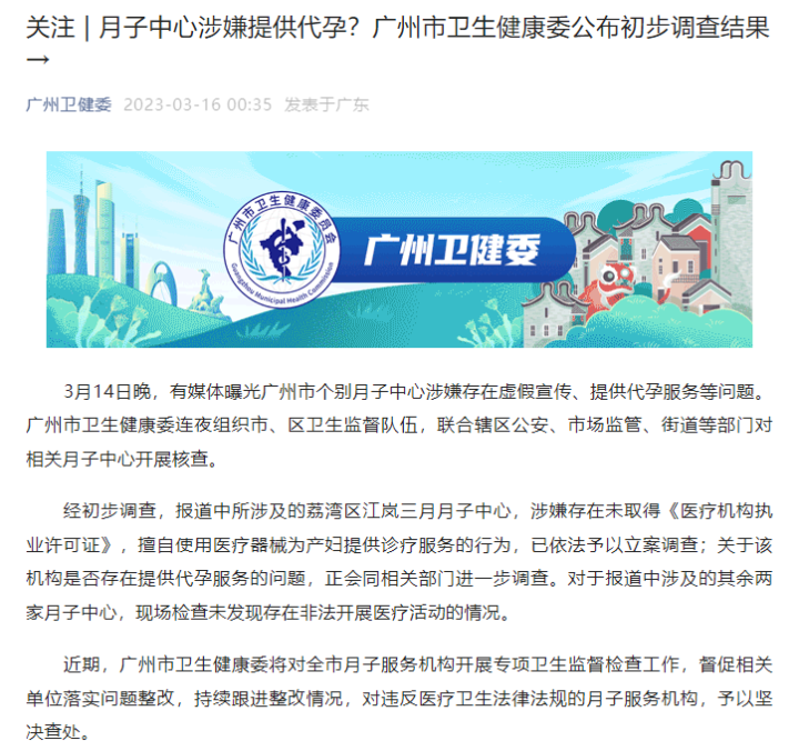 广州卫健委16日发布通报,经初步调查,报道中所涉及的荔湾区江岚三月月子中心,涉嫌存在未取得《医疗机构执业许可证》,擅自使用医疗器械为产妇提供诊疗服务的行为,已依法予以立案调查;关于该机构是否存在提供代孕服务的问题,正会同相关部门进一步调查。对于报道中涉及的其余两家月子中心,现场检查未发现存在非法开展医疗活动的情况。