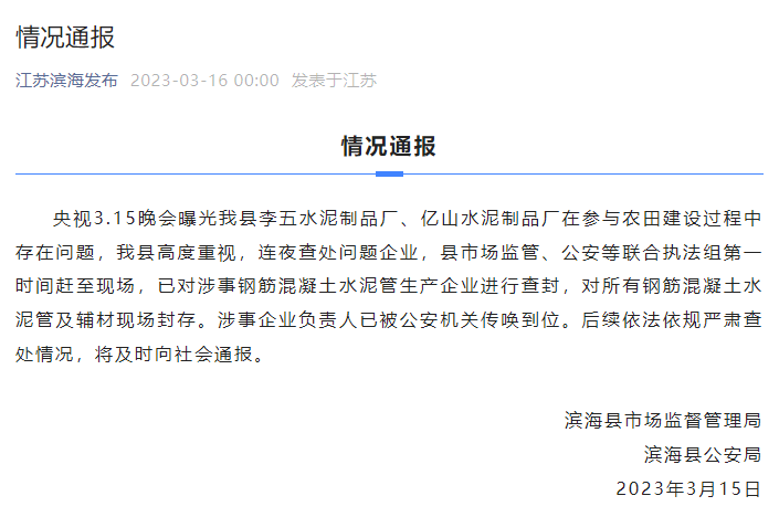 16日凌晨,江苏盐城滨海县市场监督管理局、滨海县公安局发布情况通报称,媒体报道滨海县李五水泥制品厂、亿山水泥制品厂在参与农田建设过程中存在问题,该县连夜查处问题企业,市场监管、公安等部门联合执法组第一时间赶至现场,已对涉事钢筋混凝土水泥管生产企业进行查封,对所有钢筋混凝土水泥管及辅材现场封存。涉事企业负责人已被公安机关传唤到位。后续将依法依规严肃查处,情况及时向社会通报。
