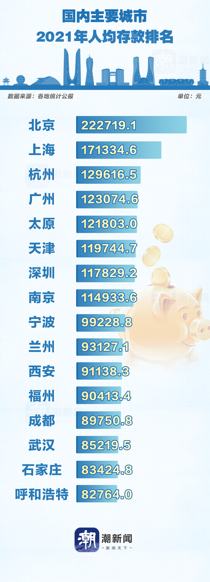 根据各个城市2021年国民经济和社会发展统计公报,论人均存款,北京22.2万元,上海17.1万元,杭州12.9万元,广州12.3万元,太原12.1万元,天津11.9万元。