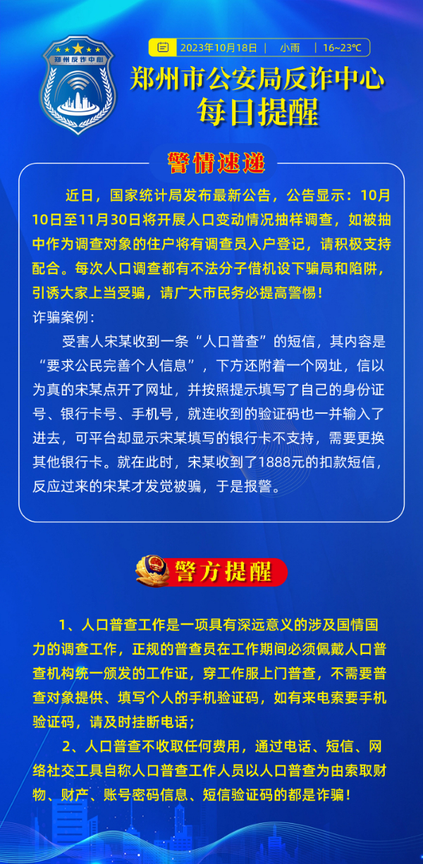 国家统计局近日发布公告显示:10月10日至11月30日将开展人口变动情况抽样调查,如被抽中作为调查对象的住户将有调查员入户登记,请积极支持配合。郑州市公安局反诈中心18日发布提醒称,人口普查不收取任何费用,通过电话、短信、网络社交工具自称人口普查工作人员以人口普查为由索取财物、财产、账号密码信息、短信验证码的都是诈骗!