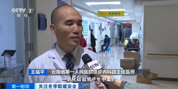 云南省第一人民医院急诊内科副主任医师 王福平:一氧化碳最常在密闭空间里产生,用煤炭烤火的时候,煤炭不完全燃烧产生一氧化碳,蓄积起来就会中毒。