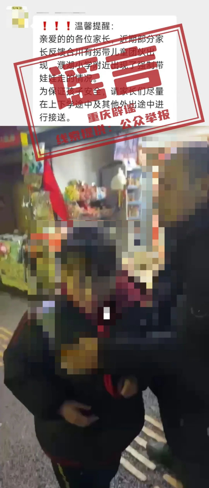 近日,有网民在社交平台发布一段小女孩在街边哭泣的视频,称重庆“合川有人在上学路上强抢小孩,学生被吓得不敢去上学”。另有网民在微信群发布“温馨提醒”,称“合川濮湖小学有人强制带走小孩”。相关信息引发众多家长关注和担忧。经核实,网传信息均系谣言。