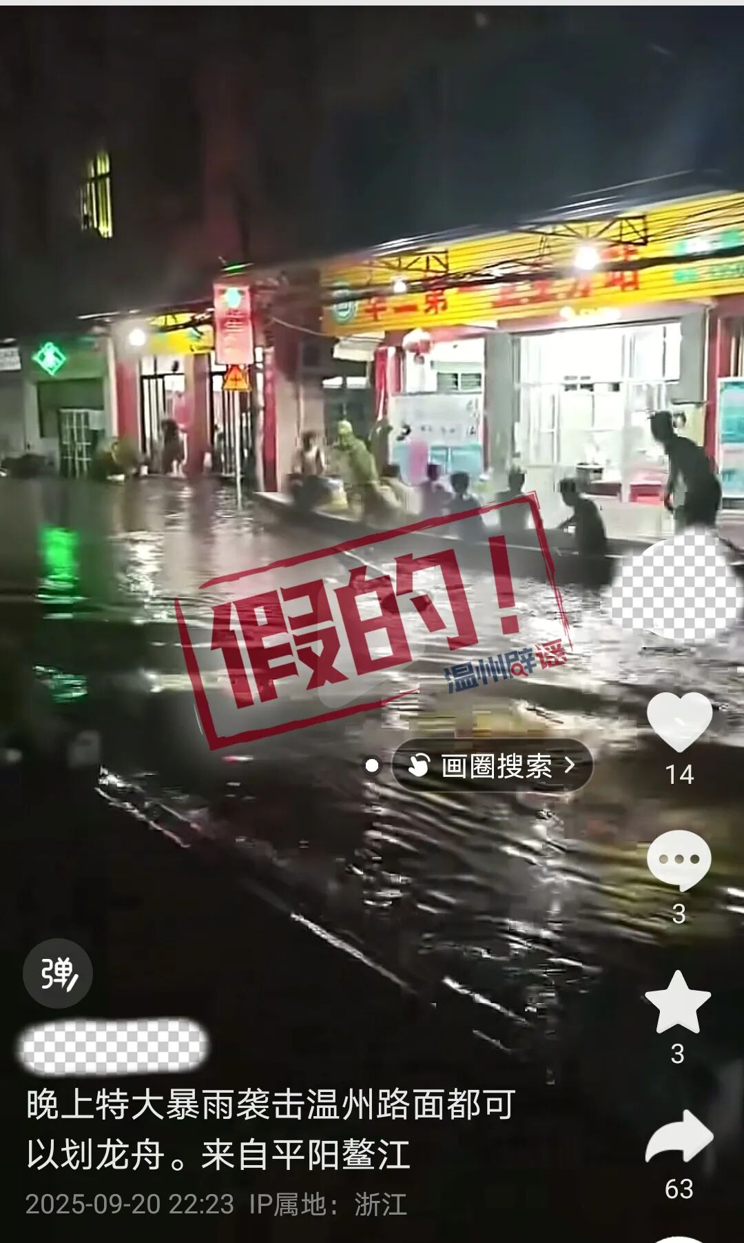 2025年9月20日晚,网民在视频平台推送视频称,“晚上特大暴雨袭击温州路面都可以划龙舟。来自平阳鳌江”等。
