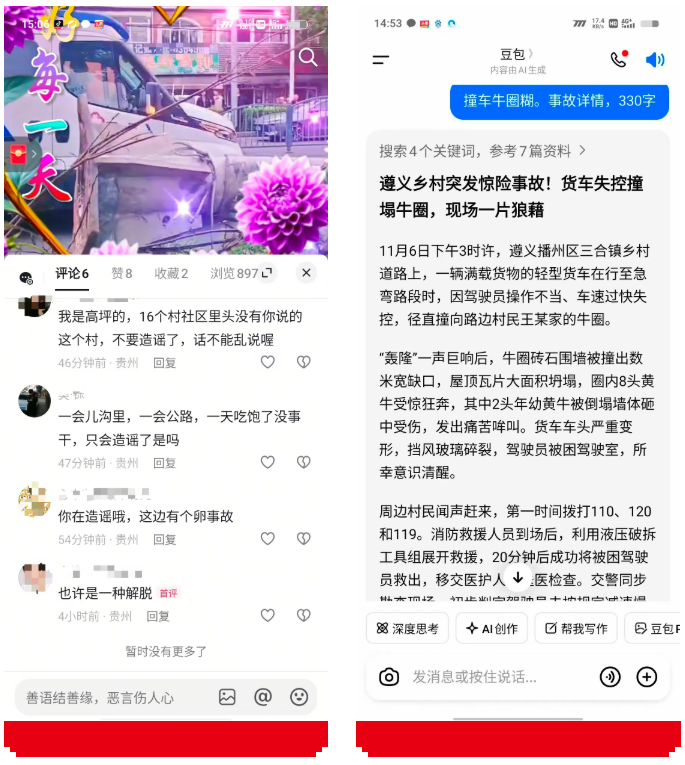 11月7日,杨某为博取关注,使用AI技术生成工具,在抖音平台连续发布两条内容不实的短视频,扰乱网络秩序,造成不良社会影响。