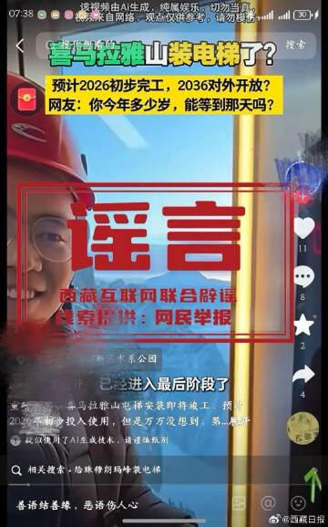 近期,接网民举报,各类珠峰安装电梯等AI生成式的虚假信息在网上频繁出现。部分营销号利用AI伪造西藏各类打卡景点虚假图文视频,用虚假话术吸引流量、诱导消费,这些信息以“逼真画面+误导性表述”混淆视听,不仅会误导公众认知,还会严重扰乱清朗网络环境。
